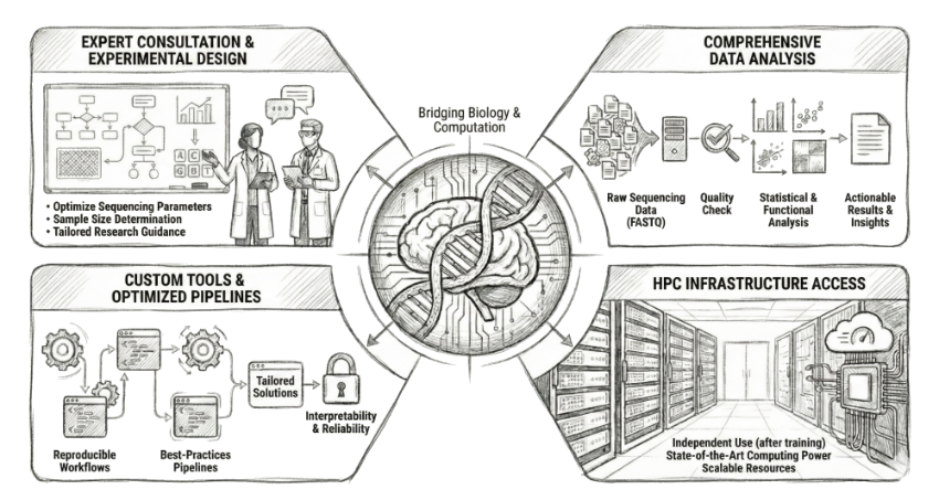 Whether you need full-service data processing, custom pipeline development, or access to high-performance computing infrastructure, our team is dedicated to ensuring your research is rigorous, reproducible, and impactful.